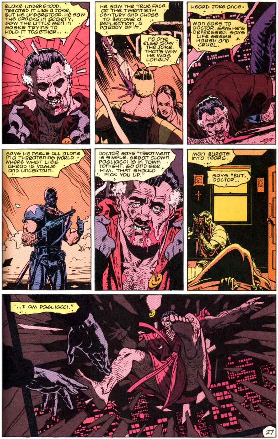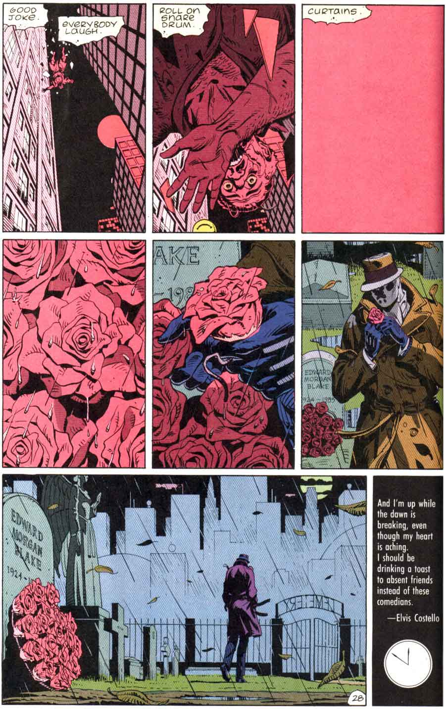 If you haven’t read the graphic novel Watchmen (or, for that matter, seen its movie adaptation), the following panels won’t make much sense to you. However, this shouldn’t stop you from enjoying Rorschach‘s thoughts, which appear throughout the novel as entries into his journal. A little background for these panels for those who do not know: Edward Blake/The Comedian has been mysteriously murdered. Rorschach is quietly visiting his grave after his funeral, reflecting on Blake’s life and personality and thinking of other “superheroes” like Blake and himself.